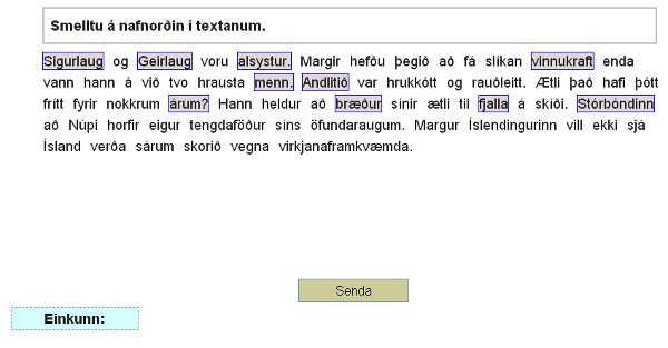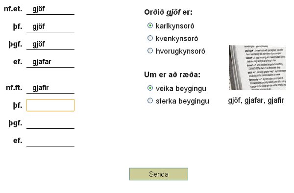 Hér reynir á þekkingu nemanda á meðferð nafnorða en honum er gert að fallbeygja orð, greina kyn þess og ákvarða hvort um sé að ræða veika eða sterka beygingu. Nemandi hakar við þau orð sem hann vill vinna með í hverri lotu og fallbeygir þau svo og greinir í gagnvirku umhverfi Stoðkennarans. Alls eru í boði 72 nafnorð sem skipt er í sex flokka. Ef nemandi greinir orð rétt þá er það merkt sérstaklega í yfirliti, en einnig er einkunn ávallt skráð í einkunnabók.