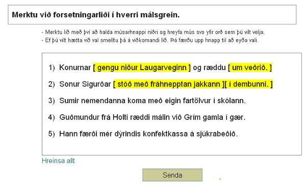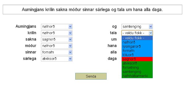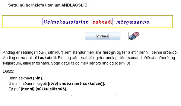 Þessi námsvöndull hentar nemendum sem hafa lokið köflum í hefti um orðflokka og setningafræði. Nemandi velur sér nokkrar setningar til að vinna með úr safni þrjátíu setninga. Verkefnið skiptist í tvo hluta. Í fyrri hluta þarf nemandi að greina orðin í orðflokka en í hinum síðari að setja hornklofa utan um setningarhluta (frumlag, umsögn, andlag…). Ef nemandi leysir verkefni með sóma þá er viðkomandi setning merkt sérstaklega í yfirliti, en einnig er einkunn ávallt skráð í einkunnabók.