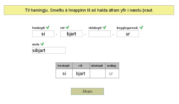 Þessi námsvöndull er hugsaður sem viðbót við þá kafla heftis sem fjalla um orðhluta og hljóðbreytingar. Nemandi byrjar á því að haka við orð sem hann vill vinna með en alls eru í boði fjörutíu orð. Verkefnið skiptist í tvo hluta. Fyrst greinir nemandi orð niður í rót, stofn, forskeyti, viðskeyti og beygingarendingu. Ef hann lýkur því með sóma þarf hann að greina hljóðbreytingu í orði. Ef nemandi greinir orð rétt þá er það merkt sérstaklega í yfirliti, en einnig er einkunn ávallt skráð í einkunnabók.