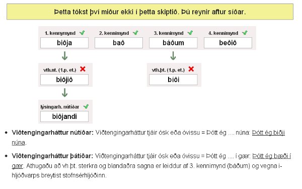 Þessi námsvöndull þjálfar allt það sem nemandi lærir um sagnorð í kennsluhefti. Nemandi velur nokkur orð úr safni sjötíu orða til að vinna með. Verkefnið skiptist í þrjá hluta. Í fysta hluta þarf nemandi að greina beygingu sagnorðs (veik, sterk, blönduð). Í öðrum hluta skrifar nemandi kennimyndir og afleiddar myndir sagnar en í þriðja og síðasta hluta þarf hann að skrifa orð í ákveðnum hætti, persónu og tíð. Ef nemandi leysir verkefni með sóma þá er viðkomandi orð merkt sérstaklega í yfirliti, en einnig er einkunn ávallt skráð í einkunnabók.