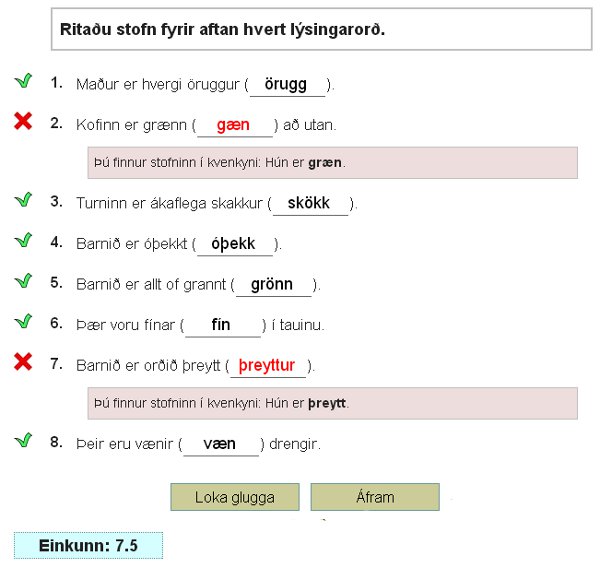 Í þessu verkefni er nemanda gert að fallbeygja fjöldann allan af nafnorðum. Nemandi hakar við þau orð sem hann vill vinna með í hverri lotu og fallbeygir þau svo í gagnvirku umhverfi Stoðkennarans. Alls eru í boði 72 nafnorð sem skipt er í sex flokka. Ef nemandi fallbeygir orð rétt þá er það merkt sérstaklega í yfirliti, en einnig er einkunn ávallt skráð í einkunnabók.