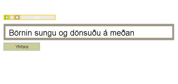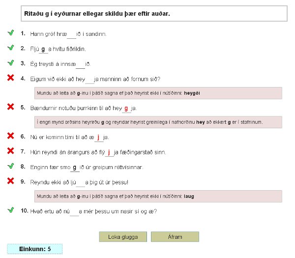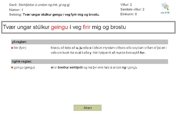 Nemandi hlustar á upplesna setningu og ritar hana svo niður og sendir Stoðkennaranum til yfirferðar. Innan við sekúndu síðar eru birtar niðurstöður, fjöldi villna og útskýringar á eðli þeirra. Í þessu verkefni eru notaðar sömu setningar og í sóknarskriftinni. Setningarnar eru samtals fjögur hundruð og er þeim skipt í flokka eftir því hvaða regla er einkum æfð.