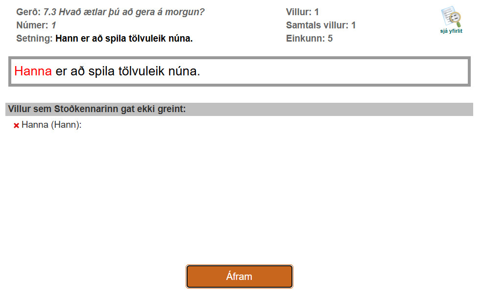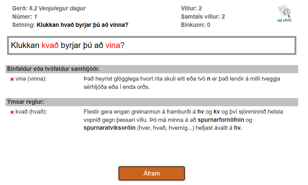 Nemandi hlustar á upplesna setningu og ritar hana svo niður og sendir Stoðkennaranum til yfirferðar. Innan við sekúndu síðar eru birtar niðurstöður, fjöldi villna og útskýringar á eðli þeirra. Orðaforðinn rímar vel við efni bókarinnar